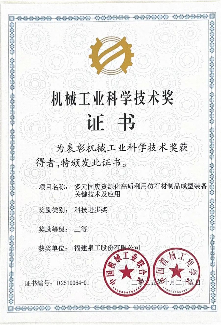 Recent, a fost anunțată oficial lista câștigătorilor pentru 2025 China Machinery Industry Science and Technology Award. Proiectul „Tehnologii cheie și aplicații ale echipamentelor de formare pentru utilizarea cu valoare ridicată a resurselor diversificate de deșeuri solide în produse de piatră simulate”, condus de Fujian Quangong Machinery Co., Ltd., a câștigat premiul al treilea pentru progresul tehnologic. Acest premiu demonstrează pe deplin recunoașterea înaltă aQuangong Machinery Co., Ltd.Capabilitățile de inovare tehnologică și realizările aplicațiilor de inginerie ale lui în domeniul utilizării cu valoare ridicată a resurselor de deșeuri solide și a echipamentelor inteligente de formare pentru produse din piatră simulată.