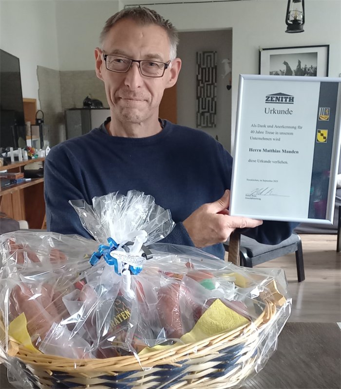 Domnul Matthias Mauden, în vârstă de 57 de ani, este la Zenith de când a finalizat un program de formare de trei ani pentru montatori mecanici. De-a lungul anilor, a lucrat în domeniul ingineriei hidraulice, deținând o expertiză profundă în cilindri hidraulici și vibratoare. În același timp, a activat și ca prim ajutor în companie, asigurând siguranța colegilor săi. Patruzeci de ani de dedicare au fost martorii călătoriei strălucitoare a creșterii sale alături de Zenith.